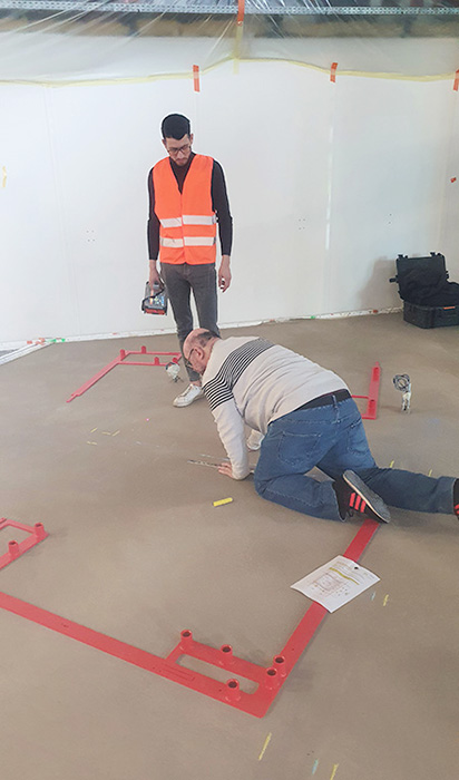 Figure 1: Eric Larquet, on his knees in the area dedicated to the microscope room at SOLEIL, is preparing the floor, including installation of drilling template for microscope mounting (December 2023).