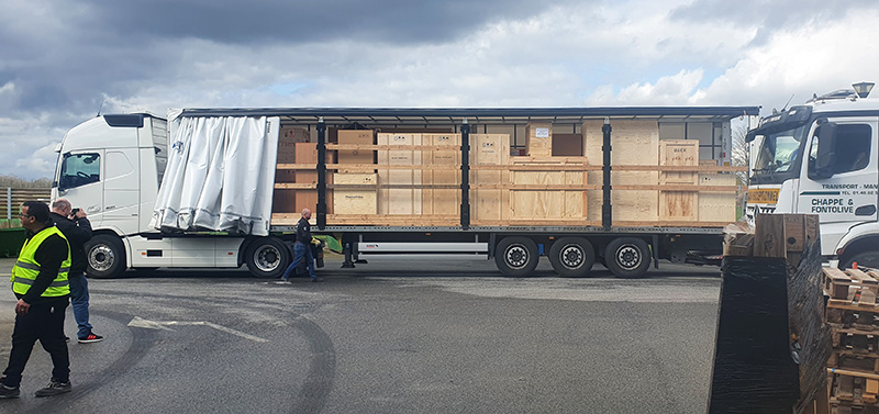 On Monday 18th March at 04h30, the lorry carrying SOLEIL’s microscope left the Thermo Fisher Scientific Eindhoven factory in order to arrive at SOLEIL at midday in order to cause minimum disruption to the program of machine physics work on the storage ring. Twenty large crates, a weight in excess of 8 tons of equipment, had to be transported, via Fenwick, from the lorry to a storage area in front of the ODE beamline in under 2 hours. Thanks to the intervention of Cyrille Azambourg, Victor Filipe (SOLEIL’s Bât-Infra group) and staff from DEMECO, the lorry was unloaded rapidly and efficiently.