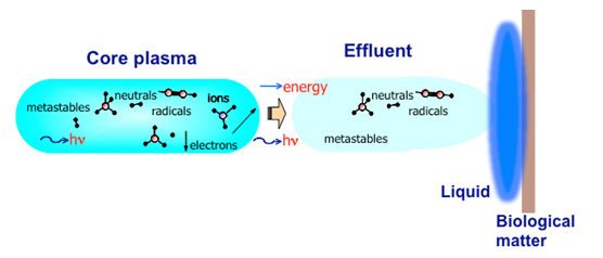 These non-equilibrium plasmas are efficient sources of highly reactive neutral particles (e.g. atomic oxygen, atomic nitrogen, hydroxyl radical, superoxide, singlet oxygen, nitrogen oxides), charged particles, UV-radiation and electro-magnetic fields – see illustration in figure 1. Such components have already individually been implicated in therapeutics, but plasmas have the advantage over current technologies to produce these species simultaneously and to exploit synergies and superior mechanisms.