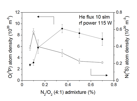 Figure 2 : Measured absolute densities of atomic oxygen and nitrogen in a radio-frequency driven cold atmospheric pressure plasma operated in helium with varying percentages of an air-like admixture.