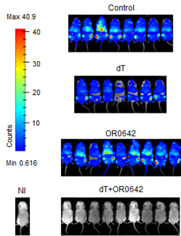 Figure 3: Effect of treatments on the development of leukemia in mouse models. Combination therapy with ORO642 and thymidine (dT) significantly reduces cancer cell growth in leukemia mice 21 days after transplantation (NI: non-injected, non-diseased mice). This experiment compares independent treatment with combined therapy, demonstrating a functional mechanism known as synthetic lethality.