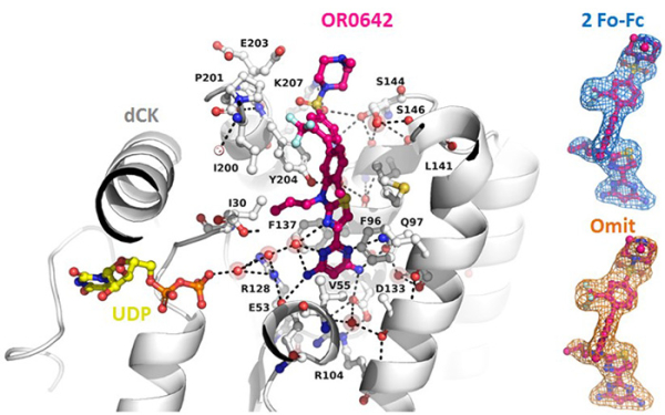 Figure 2: Crystal structure of dCK in complex with the OR0642 compound showing its binding mode. Hydrogen-bonding interactions between the OR0642 molecule (magenta) and the amino acids of the dCK protein (grey) are represented by dotted lines. Electron density maps observed around the molecule are shown on the right (2FoFc and ligand omitted (Omit)).
