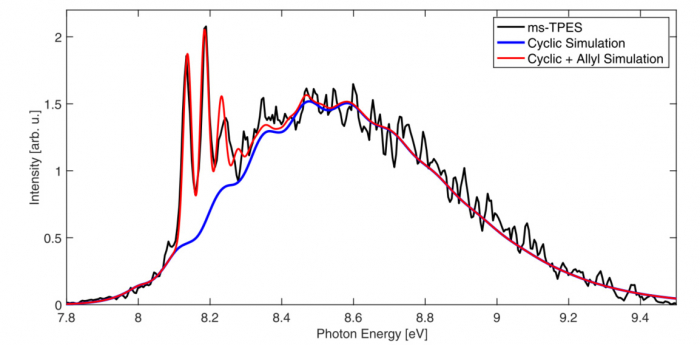 Figure 2: Correlation function-based simulation (in blue: cyclic form; in red: cyclic & linear forms) superimposed on the mass-selected threshold photoelectron spectrum (ms-TPES in black) of the cyclopropyl radical. © JACS