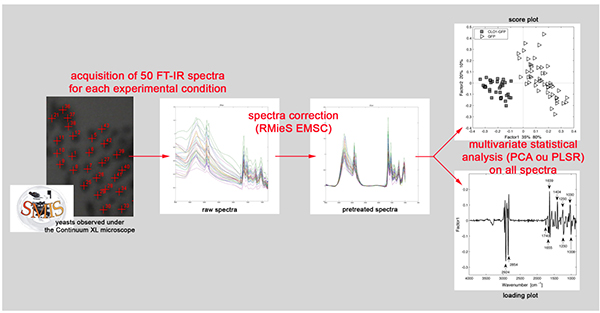 It is in this context that, the DYSCOL ('Dynamics and Structure of Lipid Bodies’ in French) team at the Jean-Pierre Bourgin Institute (INRA-AgroParisTech, Versailles) performed its research. The team is aiming at identifying the factors that affect the quantity and quality of oils produced in plants and micro-organisms. Through a genetic modification of baking yeast (S. cerevisiae), i.e.the expression of proteins involved in oil storage in plant seeds, researchers obtained strains able to produce more storage lipids. To better understand the mechanisms involved in oil accumulation in these yeasts, the scientists analysed these strains and control strains (with low oil content) by infrared microscopy (Fourier Transformed Infrared, FT-IR). This technique provides an overview of the cellular metabolism thanks to a spectral fingerprint of biological macromolecules (lipids, nucleic acids, sugars, etc.). FT-IR can replace traditional biochemical tests, which use large quantities of biomass and solvents. This means that large populations can be tested (high output approaches). Combined with the high spectral and spatial resolution offered by synchrotron light, FT-IR can be used for an analysis at the single cell scale, for statistical and population heterogeneity analyses.