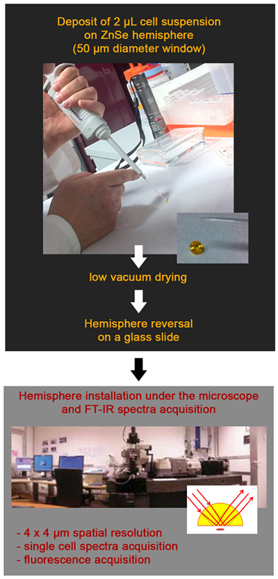 Thanks to the presence of the biology lab in the SOLEIL facility, the scientists have been able to develop a protocol allowing the FT-IR analysis of freshly-sampled cells at different growth times (1 Day = 18 hours and 2 days = 42 hours). This means that the cells could be sampled, concentrated by centrifugation, and then washed in water just few minutes prior to the observations. A drop of the cell suspension was dried on a selenium zinc (ZnSe) ATR hemisphere 4 mm in diameter. The spectra were recorded using the Continuum XL microscope available on the SMIS beamline, with a spatial resolution of 4x4 µm, which is the mean size of a cell. The spectra were then analysed by computer software (spectrum correction and statistical analyses) to evaluate spectrum variations between strains.