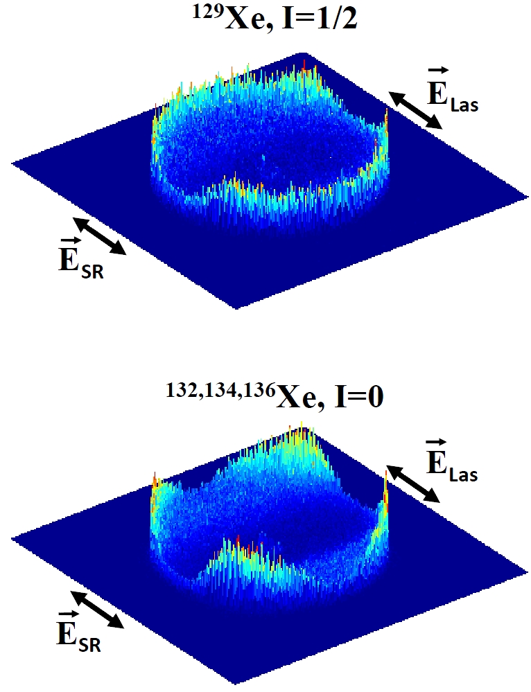 Figure 1: The raw photoelectron images for parallel linear polarizations of both SR and optical laser light of the photoelectrons taken in coincidence with the non-zero and zero nuclear spin isotopes of Xe. Copyright: American Physical Society.