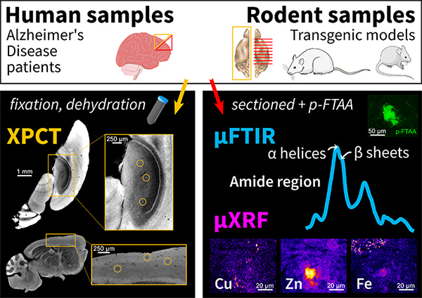 Figure 1: Samples were retrieved from human patients deceased of Alzheimer’s disease and from animal models of Alzheimer’s disease. Half of the samples were imaged using the new X-ray analysis technique (XPCT, left); on the other half, very thin brain sections were analyzed using two spectroscopic techniques (right): µFTIR for molecular composition (fibril hypothesis) and µXRF for chemical composition (metal hypothesis).