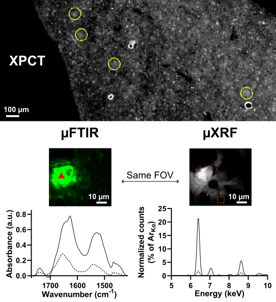 This study started with two hypotheses: XPCT detects (1) the aggregated proteins (fibrils) that compose the plaques or (2) the metals that get captured in the plaques. To find out which of these assumptions is correct, samples were scanned by XPCT on the ANATOMIX beamline and then by two spectroscopy techniques, also at SOLEIL: Fourier transform infrared microspectroscopy (µFTIR) on the SMIS beamline, and X-ray microfluorescence spectroscopy (µXRF) on the NANOSCOPIUM beamline. µFTIR detects the characteristic "signatures" of large molecules such as proteins so it was used to test the first hypothesis, while µXRF gives access to the chemical composition of the samples studied and was used to test the second.