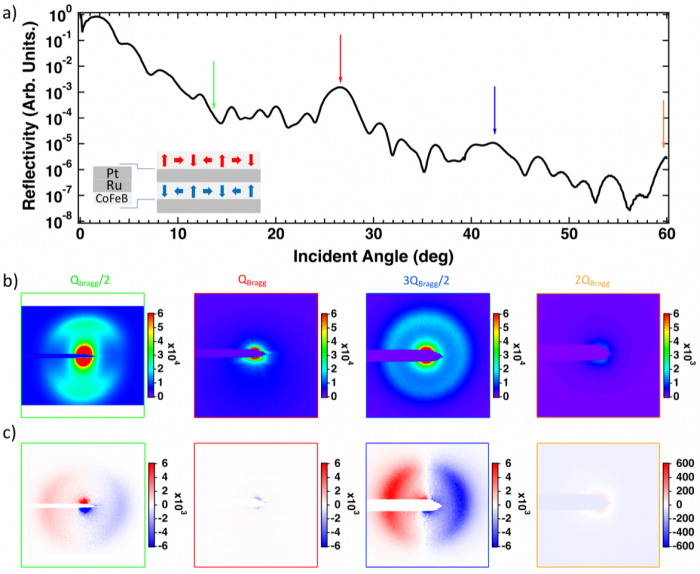 Figure 2: CD-XRMS study of a film made of 10 repetitions of a CoFeB/Ru/Pt trilayer at 300K and 707 eV photon energy (Fe L3 edge). (a) X-ray reflectivity curve using the sum (CL+CR) of the two circular polarizations. The vertical red and orange arrows point toward the position of first and second Bragg peaks. Green and blue arrows correspond to the chemical half Bragg peaks. (b) The sum images (CL+CR) corrected from the from the geometrical projection due to photon incidence angle. The magnetic scattering signal is maximum at half-integer Bragg peaks in reciprocal space and vanishes at the chemical periodicity. (c) The corresponding difference images (CL-CR) also geometrically corrected. The magnetic signal extincts at the Bragg peaks and is maximum at half-integer Bragg peaks.