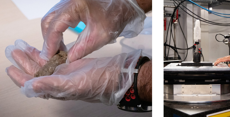 Figure 3: the curse tablet, on the left, is fixed to the sample holder in the PSICHE beamline's experimental hutch (right) after being protected in a plastic envelope to avoid any risk of impact. The sample holder is then remotely controlled to position and rotate the tablet in the X-ray beam.