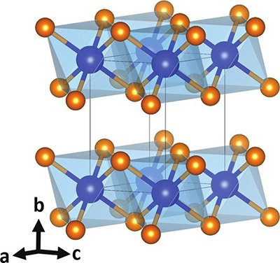 Figure 1: Diagram of the atomic organization of the lamellar compound TiS2. The titanium atoms are surrounded by 6 sulfur atoms. The TiS2 layers or sheets are separated by a distance of 0.57 nm (©Phys. Rev. B 99, 165122).