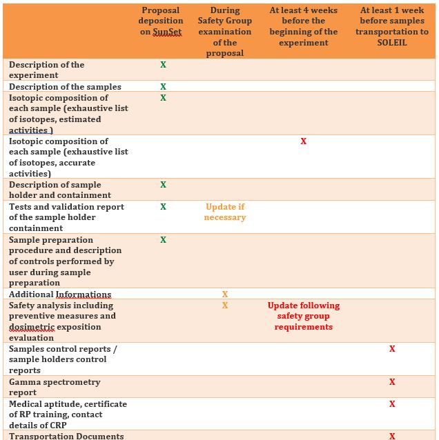 Finally, in order for the submitted proposal to be authorized by the SOLEIL safety group, it is essential that the main proposer ensures the provision of the documents and information expected by the Radiation Protection Section (SRP) in time (see Table 2 at the end of the document) in compliance with the requirements of the Nuclear Safety Authority applicable to SOLEIL.