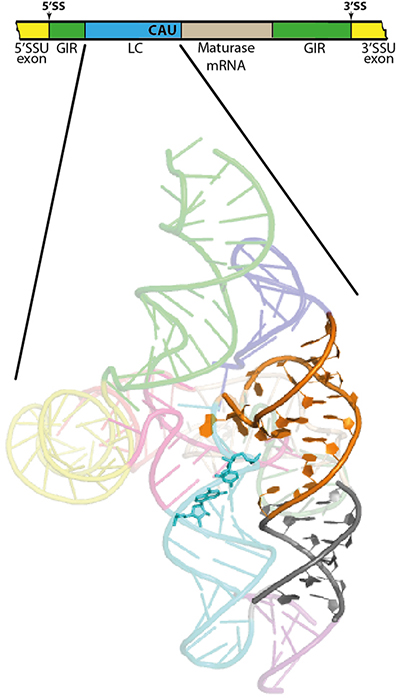Représentation linéaire de l'intron contenant le ribozyme LC (bleu). Les sites d'épissage 5' et 3' (SS) sont indiqués par des flèches situées entre les exons et le ribozyme (de groupe I, GIR) qui permet l'épissage (vert). Comme il est apparent sur la figure, le ribozyme LC (bleu) est inséré dans GIR et est suivi par un fragment codant pour une maturase. La structure cristallographique du brin d'ARN unique correspondant au ribozyme LC est représentée sous forme de ruban dont une partie schématisée à la manière d'un modèle atomique permet de visualiser les caractéristiques générales des structures complexes d'ARN (hélices orange et grise).