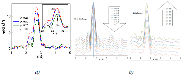 L'analyse EXAFS a contribué à démontrer que le Ti1-yNbySnSb consiste en des phases uniques formées de domaines cristallographiques de TiSnSb-NbSnSb dans diverses proportions en fonction de la composition de Ti/Nb. La réversibilité du mécanisme électrochimique a pu être démontrée à partir des spectres enregistrés en mode operando. D'autre part, pour la première fois dans l'étude d'un matériau de type conversion, il a été montré qu'une faible quantité de Sb (et/ou de Sn) provenant de la matrice de Li3Sb (ou LixSn) diffuse dans les nano particules du métal de transition (Nb dans le cas présent) dans l'électrode entièrement déchargée, ce qui démontre la forte métastabilité de l'électrode dans cet état déchargé.