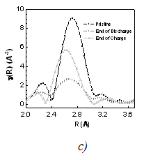 Transformées de Fourier des spectres EXAFS enregistrés au seuil K du Nb dans le Ti1-yNbySnSb de départ (a), dans la batterie NbSnSb/Li pendant la première charge/décharge (b) et pour la pristine, la fin de la décharge et la fin de la charge (c)