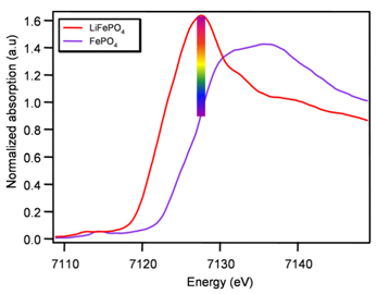 Fig. 1 Xanes normalisés du composé initial LiFePO4 (courbe rouge) et du composé final FePO4 (violet) enregistré au seuil K de Fe.