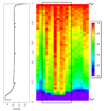 Les données ont été recueillies en même temps dans le mode de transmission, à travers un trou dans la cellule, et en mode de fluorescence sur toute la surface de l’électrode. En transmission, seulement 12,5 mm2 de l’électrode peuvent être cartographiés mais la carte est représentative de l'épaisseur totale de l'électrode. En fluorescence, la totalité de la surface de l'électrode positive peut être étudiée, mais seulement à environ 7 µm de profondeur. La Fig. 2 représente les cartes obtenues en fluorescence en mode dynamique pendant la charge pour l’extraction d’un ion lithium en une heure. La distribution de la proportion de FeII est clairement hétérogène avec certaines parties de l'électrode contenant plus de LiFePO4 que prévu, alors que d’autres endroits en contiennent moins. Nous avons également observé une nette influence du trou de la cellule expérimentale (lignes en pointillés). C'est probablement dû à la différence de pression appliquée à la position du trou où le contact électrique avec le collecteur de courant est moins efficace. Dans ce cas, l'hétérogénéité est attribuée à un transfert d'électrons limité. Cette observation importante fournit une explication raisonnable du retard apparent observé en transmission par XRD par plusieurs auteurs : la zone exposée pour XRD montre un « retard » causé par un plus petit contact électrique (plus petite pression) au centre de l'électrode.