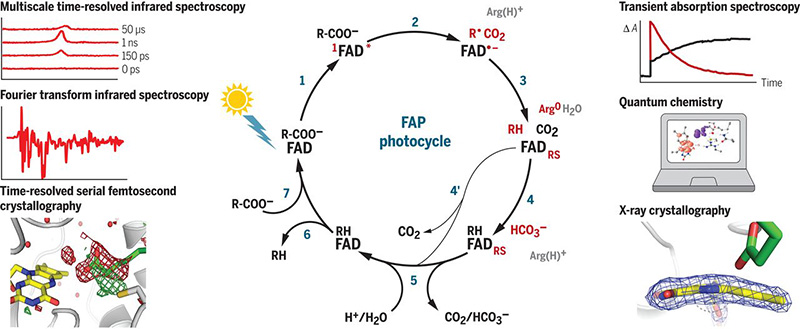 Elucidation du photo-cycle de l'enzyme FAP en combinant des études spectroscopiques, biochimiques, cristallographiques et de calcul théorique. (c) Science