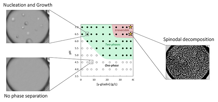 Les scientifiques ont montré que les γ-gliadines encapsulées dans les vésicules peuvent subir une séparation de phases induite par le pH selon deux mécanismes distincts, en fonction de la concentration en protéines. À faible concentration, les γ-gliadines se séparent par un processus de nucléation et croissance, tandis qu'à des concentrations plus élevées, elles forment une phase bicontinue suggérant un mécanisme dit de décomposition spinodale (voir Figure 2). Dans toutes les conditions, les assemblages de γ-gliadines se localisent soit à la surface de la membrane et/ou se déposent au fond des vésicules.