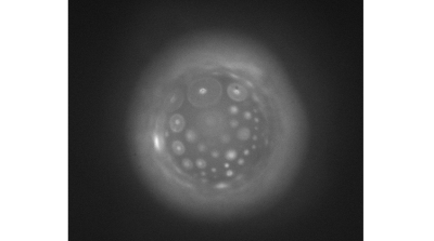 Photo d’illustration (page d’accueil) : Corpuscules de gliadine adsorbés sur une gouttelette d’huile – image de microscopie d’autofluorescence obtenue sur DISCO