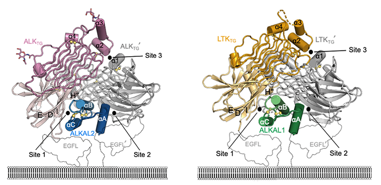 Cette nouvelle étude, menée par Steven De Munck, doctorant de l'équipe du Professeur Savvas Savvides (VIB-UGent Center for Inflammation Research, Belgique), en collaboration avec le National Cancer Research Institute de Tokyo, le Memorial Sloan Kettering Cancer Center (New York) et la société ħ Bioconsulting LLC (Minnesota), a révélé la structure 3D de deux récepteurs de cette famille : ALK et LTK (récepteur kinase des leucocytes), ainsi que leur structure lorsqu'ils sont liés à leurs protéines-signal respectives - des cytokines. Ces structures 3D fournissent des informations essentielles pour comprendre la fonction de ces récepteurs.