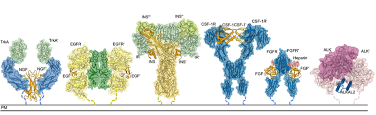 Figure 2 : comparaison entre le complexe ALK-cytokine (tout à droite) et tous les autres modes d'interaction connus à ce jour entre les différents récepteurs à tyrosine kinase et leur molécule-signal.