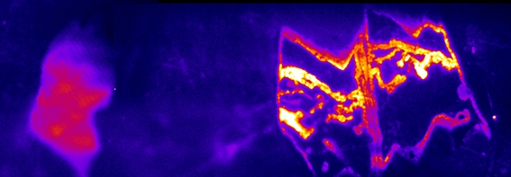 Figure 1 : Image d'autofluorescence UV collectée sur la ligne de lumière DISCO, à SOLEIL. Elle met en évidence dans une argile la présence d'un acide aminé, le tryptophane, formé abiotiquement lors de l'altération de la croûte océanique (© IPGP).