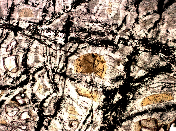 Figure 2 : Photo en microscopie optique d’une section fine de la roche dans laquelle a été détecté le tryptophane (acide aminé) abiotique. La roche est composée de serpentine et de saponite riches en fer (en jaune-marron sur la photo) disséminées dans un réseau de magnétite (en noir) © IPGP.