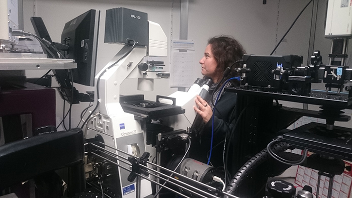 Figure 3: Céline Pisapia (Institut de Physique du Globe de Paris, Université Paris Diderot) sur la ligne de lumière DISCO où ont été réalisée les mesures de fluorescence en UV profonds qui ont permis de détecter la présence de tryptophane dans ces roches océaniques (© IPGP).