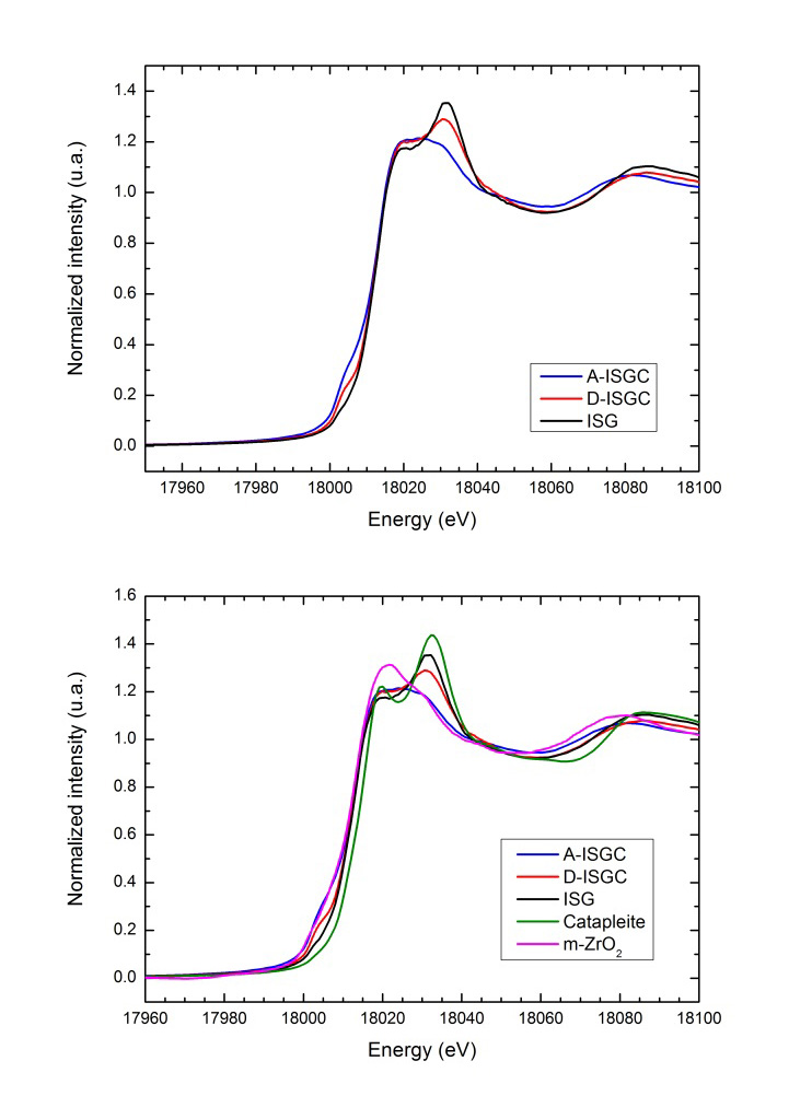 D’après les spectres de fluorescence XANES, aucun changement n'est survenu dans l'environnement local du Cm. Par ailleurs, un résultat intéressant en lien avec les spectres sur le seuil K du Zr (figure 2) a été obtenu. Les chercheurs ont tenté d'évaluer qualitativement les proportions des différents sites de symétrie dans les 3 verres ISG, D-ISGC et A-ISGC. Pour ce faire, ils ont combiné les spectres XANES de l'elpidite et du m-ZrO2, structures cristallines où Zr est respectivement présent dans des sites de coordination d'ordre 6 et 7. Il est ainsi apparu que le verre ISG est majoritairement (85%) composé d’elpidite et d’une faible proportion de m-ZrO2 (autour de 15%). Cette proportion d’elpidite passe à 58% dans le verre endommagé D-ISGC, et à environ 10 % dans le verre recuit A-ISGC.
