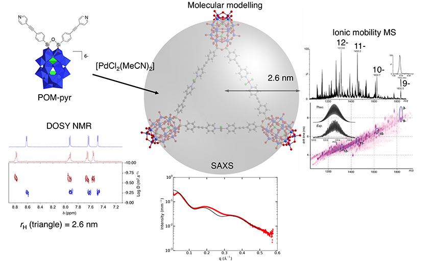 Un premier assemblage a été développé à partir d’un hybride ditopique (présentant deux fonctions chélatantes). Suite à sa réaction avec un complexe assembleur neutre, le trans-[Pd(MeCN)2Cl2], une unique espèce discrète se forme. Cet assemblage, un triangle moléculaire, a été caractérisé par combinaison de différentes techniques d’analyse, telles que la RMN diffusionelle (DOSY) et la spectrométrie de masse à mobilité ionique, ainsi que par modélisation moléculaire (Figure 1).