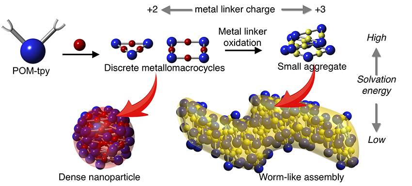 Par la suite, l’étude de la complexation d’un POM hybride analogue présentant deux fonctions terpyridine (tpy) par des complexes assembleurs cationiques divalents, tels que le Fe(II) ou le Co(II), a montré que les polygones moléculaires formés (mélange de triangles et carrés moléculaires) étaient quant à eux susceptibles de s’agréger par interactions électrostatiques en fonction de la nature du solvant, et de former ainsi des architectures moléculaires multi-échelles inédites. L’agrégation des métallomacrocycles résulte de la compétition entre leur énergie de solvatation et celle de leurs interactions électrostatiques intermoléculaires. Enfin, la forme de ces assemblages hiérarchiques a pu être modifiée en jouant sur l’état redox du cation métallique assembleur, modifiant ainsi les interactions électrostatiques entre assemblages supramoléculaires primaires (Figure 2).