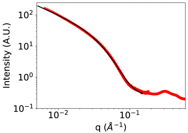 Figure 3 : Comparaison du signal SAXS expérimental des assemblages vermiculaires dans un mélange DMSO/MeCN 1/4 (courbe rouge) avec le signal théorique (obtenu à partir du logiciel SASview) en utilisant un modèle de cylindre flexible de 3.4 nm de rayon (polydispersité 35 %, courbe noire).