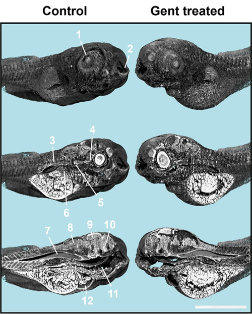 La gentamicine est un médicament appartenant à la classe d'antibiotiques appelée aminoglycosides qui, chez l'Homme, sont toxiques pour les reins et l'oreille interne. Les aberrations morphologiques rénales induites par la gentamicine ne sont donc pas spécifiques aux larves de poisson-zèbre. Les scientifiques suisses ont évalué et suivi l'impact de la gentamicine sur l'anatomie rénale des larves de poisson-zèbre et ont extrapolé les résultats à la structure rénale des souris. Pour leurs études en microscopie utilisant la lumière visible, ils ont utilisé des lignées de poisson-zèbre génétiquement modifiées de façon à ce qu'une partie de leurs structures rénales (glomérules) produise une protéine fluorescente verte (GFP), ce qui facilite la visualisation des lésions potentielles de ces structures lorsqu'elles sont analysées par microscopie confocale à balayage laser.