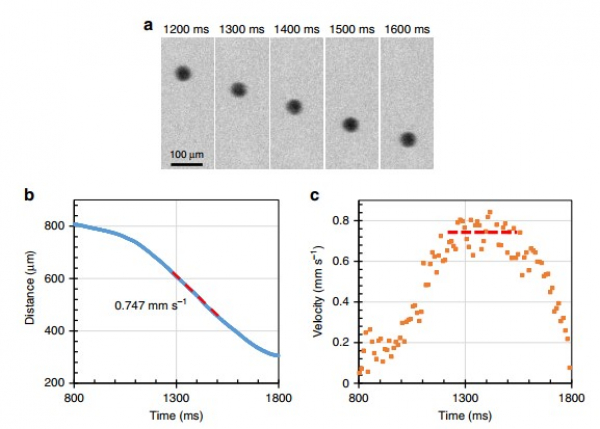 (c) Courbe de vitesse de la bille en fonction du temps (intervalles de 10ms). La ligne rouge pointillée représente le meilleur ajustement des données localisées au niveau du “plateau de vitesse”, correspondant à la vitesse limite.