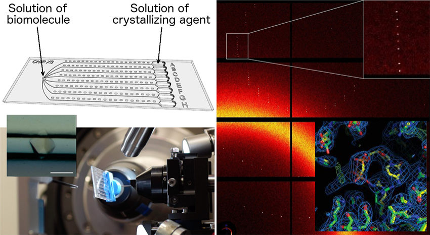 Afin d'élargir l'attrait et la fonctionnalité des puces microfluidiques au-delà de la cristallisation et du criblage à haut débit, plusieurs équipes ont exploré la possibilité d'analyser les cristaux directement dans leur environnement microfluidique. Dans un article récent, une équipe française (CNRS – Université de Strasbourg) propose en collaboration avec des équipes de Grenoble, Marseille, Leipzig (DE), Granada (ES) et trois synchrotrons européens (SOLEIL, ESRF, SLS), une puce microfluidique polyvalente et peu coûteuse pour la production et la caractérisation de cristaux. Cette puce a été initialement conçue pour miniaturiser et faciliter l'identification des conditions de croissance cristalline par la méthode de contre-diffusion et son processus efficace d'auto-optimisation.