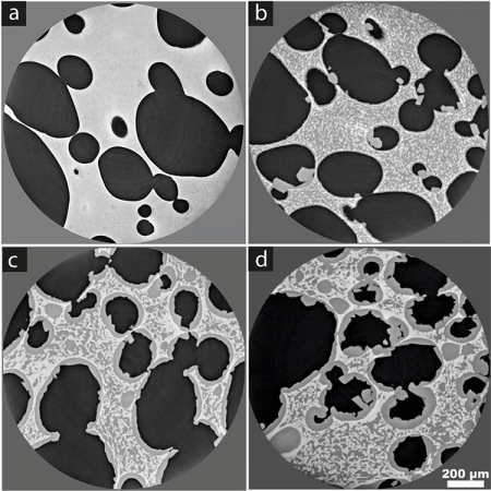 L’un des défis dans ce travail est de pouvoir accéder à des images en 3D avec un contraste suffisant au sein de la génoise permettant de différencier les pores, la glace et la matrice et avec une résolution spatiale allant de l’échelle submicronique à plusieurs centaines de microns et une résolution temporelle acceptable. Seule la microtomographie par rayons X au synchrotron permet d’accéder à de telles images (Figure 2).