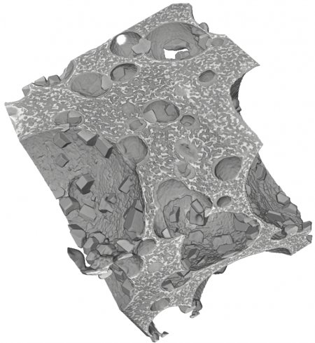 Figure 3 : Visualisation 3D de la structure poreuse d’une génoise congelée rapidement. La matrice est représentée en blanc alors que la glace est représentée en gris. La répartition et la morphologie des cristaux de glace à l’interface des pores apparaissent clairement.