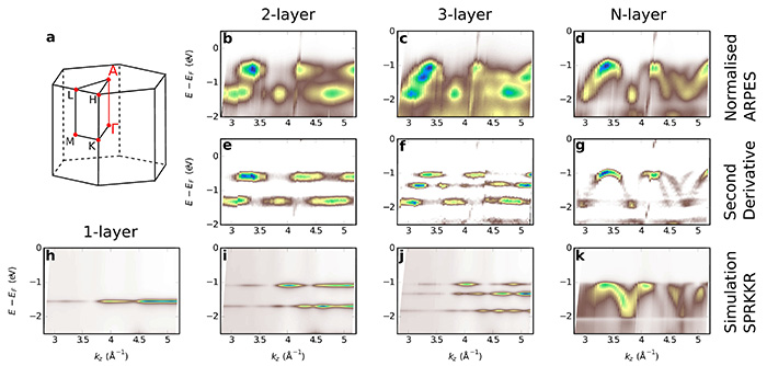 Les parties (b-d) de la figure 2 montrent les données brutes pour les trois échantillons. Pour l’échantillon de 2 couches, les deux bandes les plus proches du niveau de Fermi ont clairement une dispersion en kz discontinue, consistant en des segments linéaires (pas de dépendance de l’énergie de l’électron avec le vecteur d’onde) correspondant aux gammes en kz sur lesquelles ces bandes apparaissent. Le même phénomène est observable sur l’échantillon de 3 couches, avec cette fois-ci trois bandes apparaissant ou disparaissant. Néanmoins, les segments brillants sont plus courts en kz et plus nombreux pour chaque bande. Ils commencent à dessiner les oscillations de bandes que l’on voit clairement sur l’échantillon de 6-7 couches, où la dispersion observée est très similaire à celle mesurée dans des cristaux massifs de WSe2. Cette évolution est plus visible sur la dérivée seconde des images (parties (e-g)). Les parties (h-k) présentent des calculs réalisés à l’aide du programme SPRKKR, qui résout l’équation de Dirac en utilisant la diffusion multiple et les fonctions de Green. Ils reproduisent très bien les résultats expérimentaux.