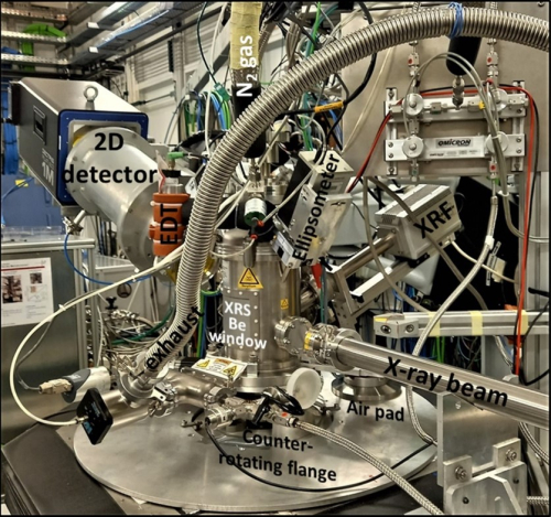 La synthèse en deux étapes a été développée dans un réacteur portable construit sur mesure au LMGP et monté sur la tour à 6 axes du diffractomètre NewportTM de la ligne SIRIUS (Figure 2). Cette installation permet d'utiliser un ensemble complémentaire de techniques d’analyse in situ : la réflectivité des rayons X, les spectroscopies de fluorescence et d'absorption des rayons X et la diffusion des rayons X en incidence rasante.