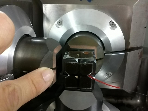 Le cœur de la presse multi-enclumes installée sur la ligne PSICHE de SOLEIL. Un faisceau de rayon X (illustré par le doigt) permet de détecter in situ la fusion de l’échantillon mantellique comprimé au centre des enclumes cubiques jusqu’à une pression de plus de 250 000 atmosphères, soit la pression régnant à 670 km de profondeur dans le manteau.