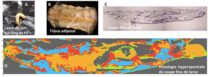 Cependant, bien que la larve de Gm mâche le PE (figure 1A), il n’a pas été formellement démontré qu’elle le transforme en biomasse. La littérature scientifique est d’ailleurs ambigüe sur le rôle de la larve et/ou de son microbiote intestinal.