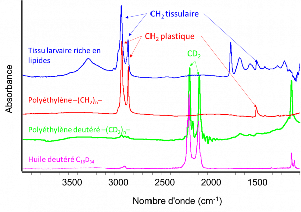 Afin de lever cette ambiguïté, l’équipe de chercheurs a développé une technique combinant imagerie hyperspectrale infrarouge de tissus de larve et marquage isotopique du PE. En effet, la spectroscopie infrarouge ne permet pas de distinguer le PE, de formule chimique [–CH2–]n, des lipides des tissus adipeux de la larve de Gm eux aussi composés majoritairement de CH2 (figure 2). Des larves de Gm ont alors été nourries avec du PEHD marqué par un traceur : le deutérium, isotope de l’hydrogène. Dans ce PEHD marqué, les -CH2– sont remplacés par des groupements deutérés CD2. Or, en spectroscopie infrarouge, ces groupements CD2 se distinguent fortement des groupements CH2 des tissus adipeux de la larve (figure 2). Les PE normaux (CH2) ou deutérés (CD2) ont néanmoins les mêmes propriétés physicochimiques.