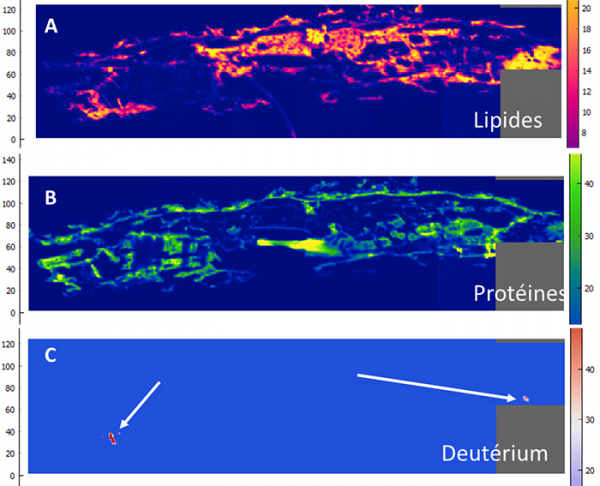 Figure 3 : Images hyperspectrales infrarouges de coupe fine d’une larve ayant ingéré du PE deutéré. Distribution A) des lipides, B) des protéines et C) du deutérium (liaisons C–D). On ne détecte pas de deutérium dans le tissu mais des particules de PE deutéré dans la partie buccale et le rectum de la larve.