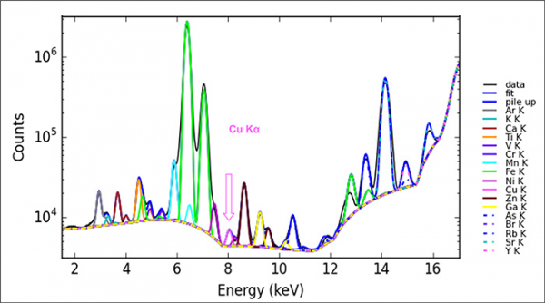 Figure 2 : Exemple de spectre d’analyses XRF mesuré sur la ligne DIFFABS. Légende : Ar = argon, K = potassium, Ca = calcium, Ti = titane, Cr = chrome, Mn = manganèse, Fe = fer, Ni = nickel, Cu = cuivre, Zn = zinc, As = arsenic, Br=brome, Rb = rubidium, Sr = strontium, Y = yttrium, Pb = plomb.