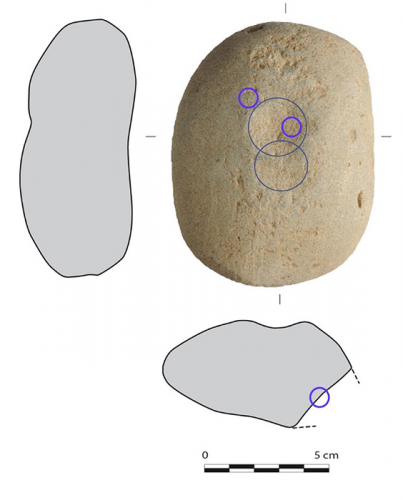 Figure 1 : Outil de concassage et broyage ; cercles violets : points d’analyses XRF (photos et sections: E. Collado, dessins: V. Brisotto)