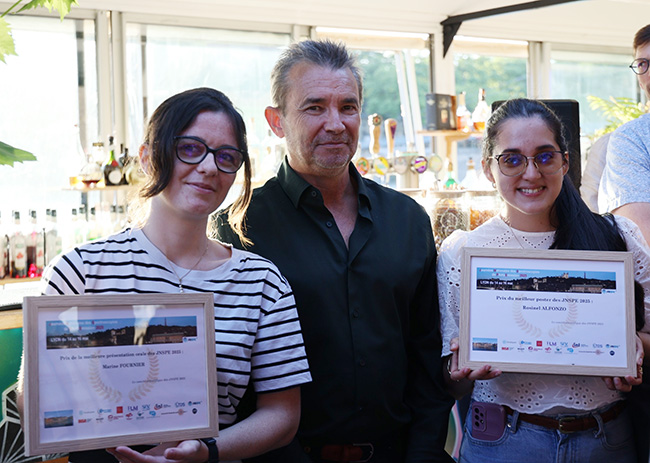 Remise des Prix à la JNSPE 2025. De gauche à droite : Marine Fournier (Prix de la meilleure présentation orale), Hervé Martinez (président du conseil scientifique de la FR SPE) et Rosinel Alfonzo (Prix du meilleur poster).