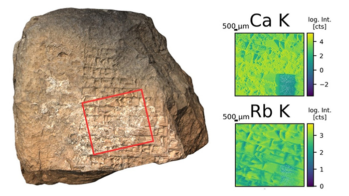Pour révéler les signes cunéiformes cachés sous le sel, des chercheurs de l'Université de Gand, avec le soutien du programme IPERION-HS et en collaboration avec la ligne PUMA de SOLEIL, ont utilisé la spectroscopie de fluorescence X, une technique d’analyse non invasive.