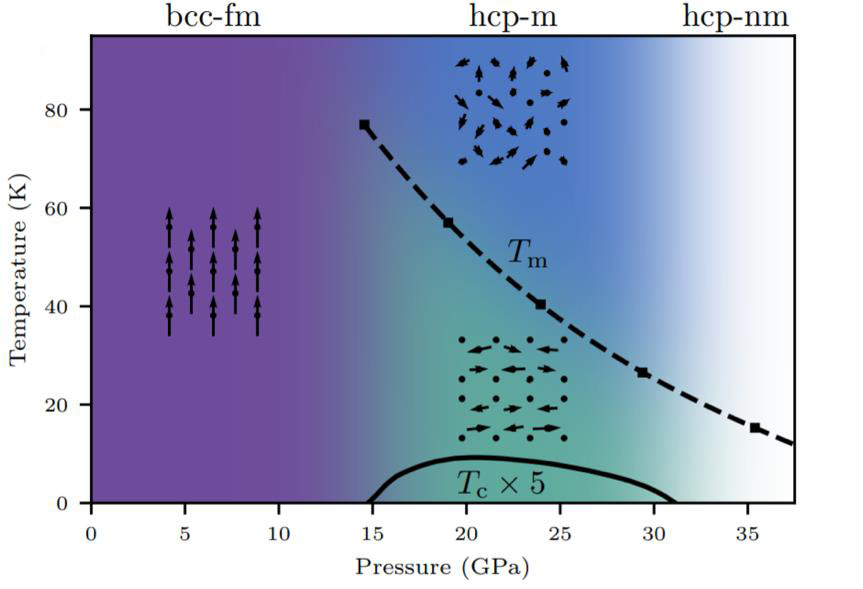 Fig 1: Diagramme de phase du fer. La structure cubique ferromagnétique correspond au domaine violet. La phase haute pression ε-fer, qui cristallise dans une structure hexagonale, correspond au domaine bleu / vert pour les phases magnétiques, et au domaine blanc pour les phases non magnétiques. Les calculs des chercheurs prédisent que les moments magnétiques désordonnés (domaine bleu) s’arrangent en une phase “smectite de spin” (domaine vert) en dessous d’une température critique Tm, qui pourrait être connectée aux propriétés supraconductrices de la phase ε-Fe (le dôme de supraconductivité est représenté et indiqué par Tc).