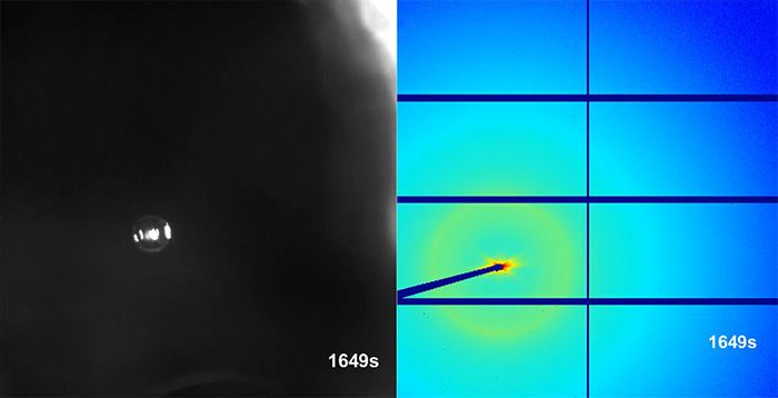 Figure 2 : à gauche : exemple d’image extraite du film de l'évaporation d'une gouttelette de 1 µL de nanotubes d’argile pendant les mesures de SAXS in situ. À droite : pattern SAXS obtenu pour la gouttelette de l’image de gauche.